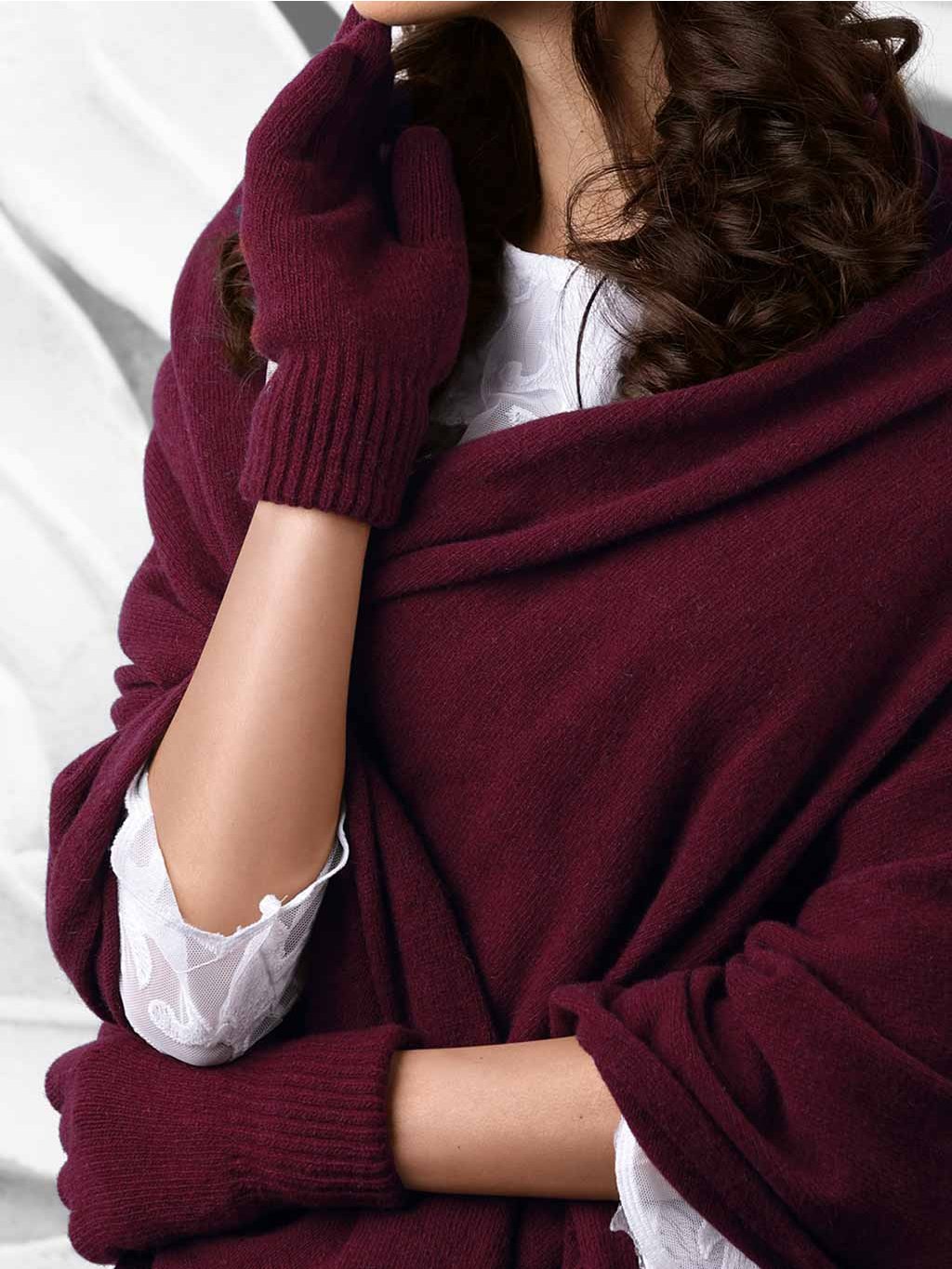 Tieto bordové rukavice sa hodia k väčšine šálov, čiapok, baretiek a klobúkov Kamea, majú univerzálnu veľkosť.